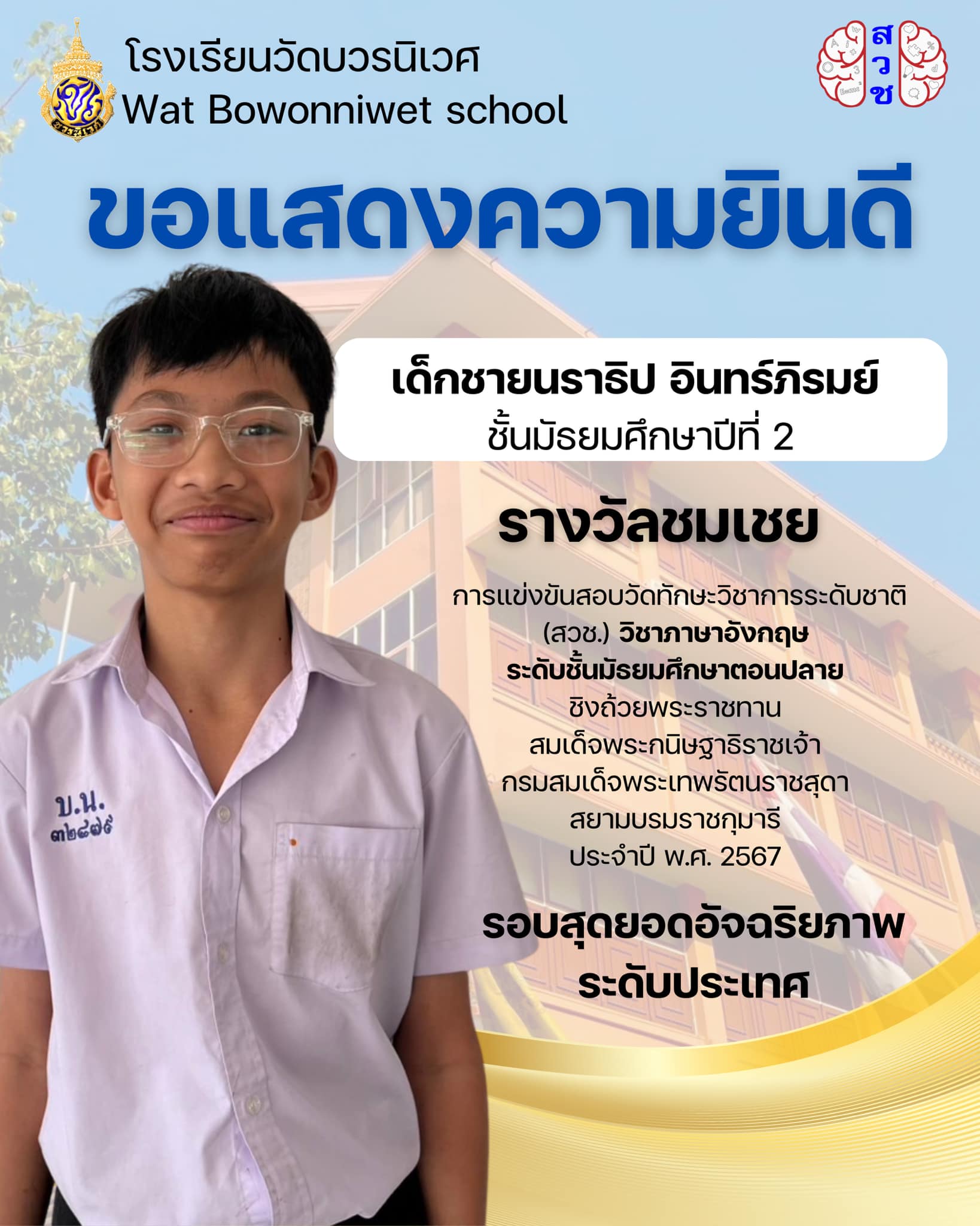 1. เด็กชายนราธิป อินทร์ภิรมย์ ชั้นมัธยมศึกษาปีที่ 2 ได้รับ “รางวัลชมเชย”